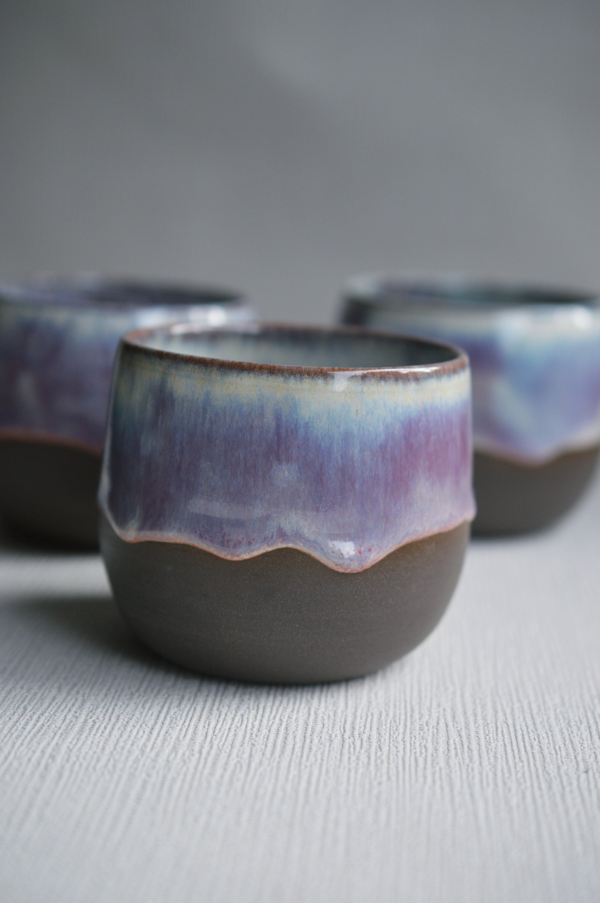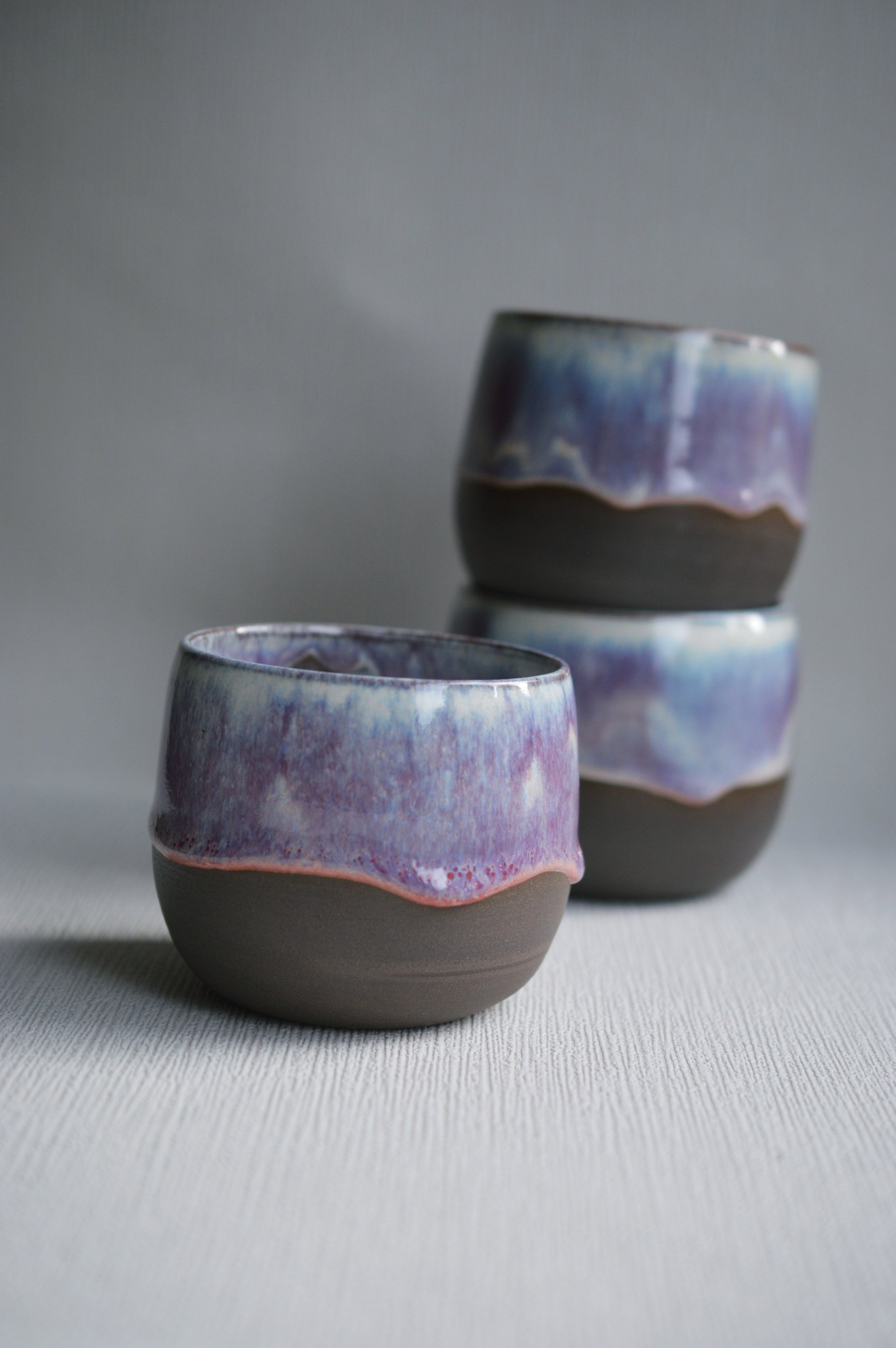 Handgemachter Becher aus Steinzeugkeramik mit lila und bläulicher Glasur