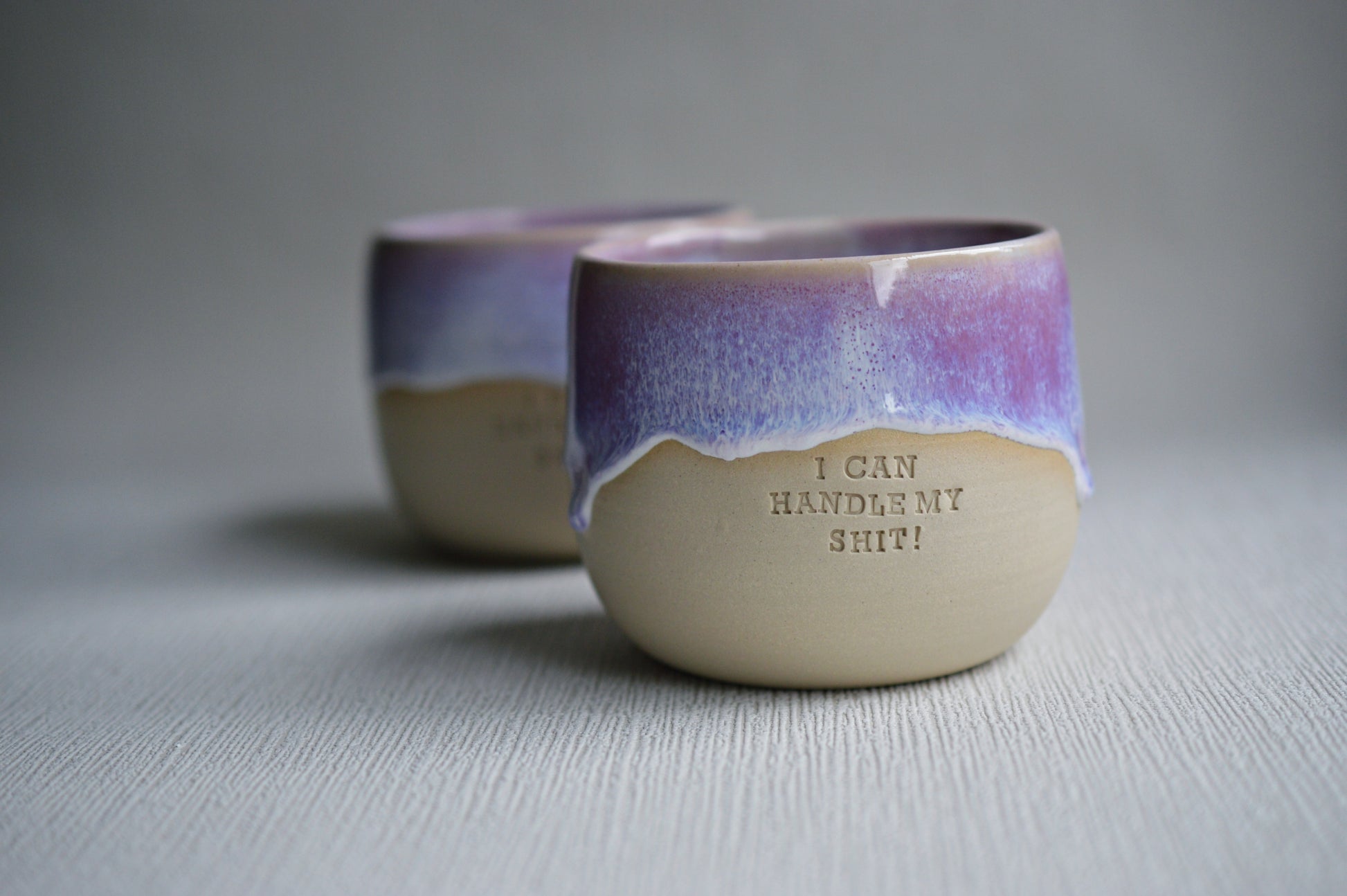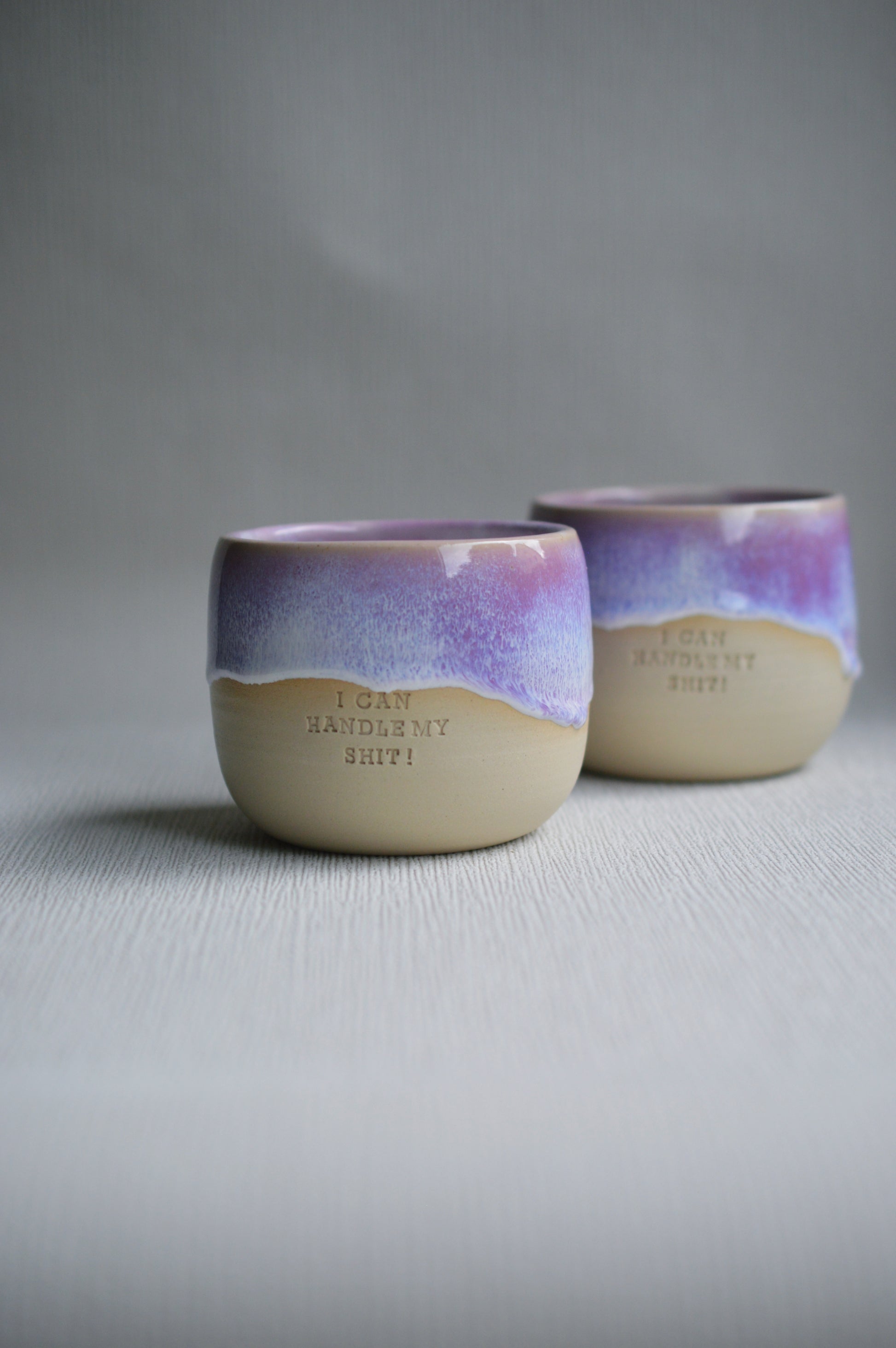 Handgemachter Becher aus Steinzeugkeramik mit rosa/ lila Glasur und dem Schriftzug "I CAN HANDLE MY SHIT!"