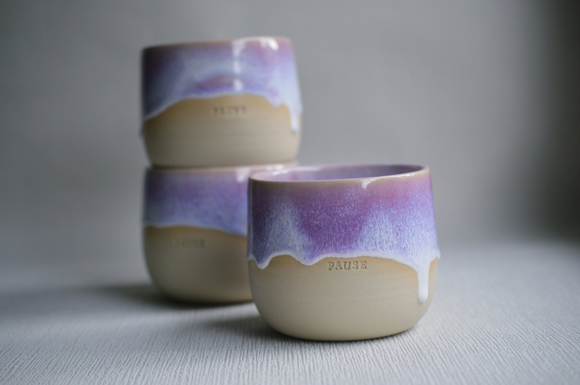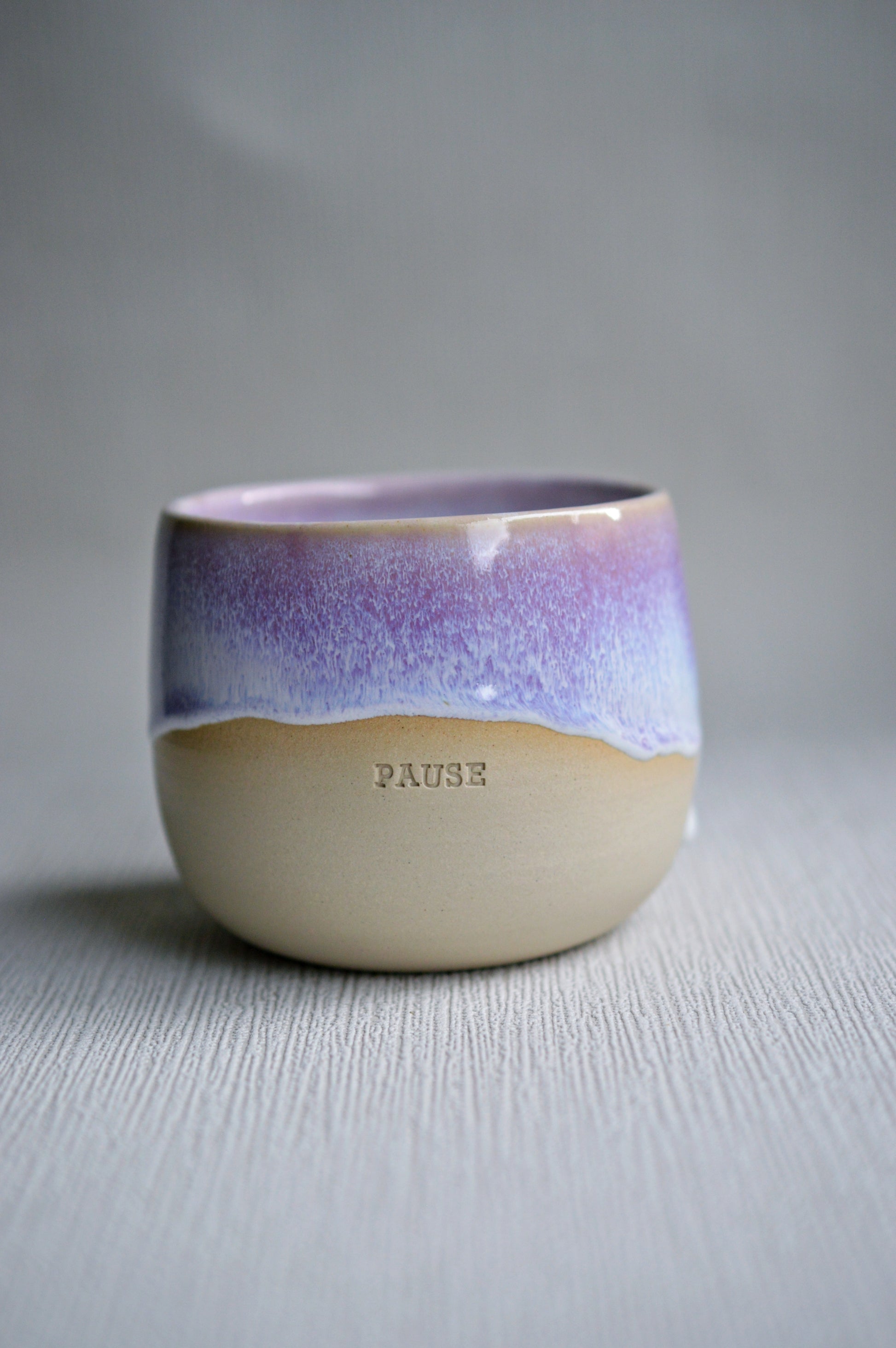 Handgemachter Becher aus Steinzeugkeramik mit rosa/ lila Glasur und dem Schriftzug "Pause"