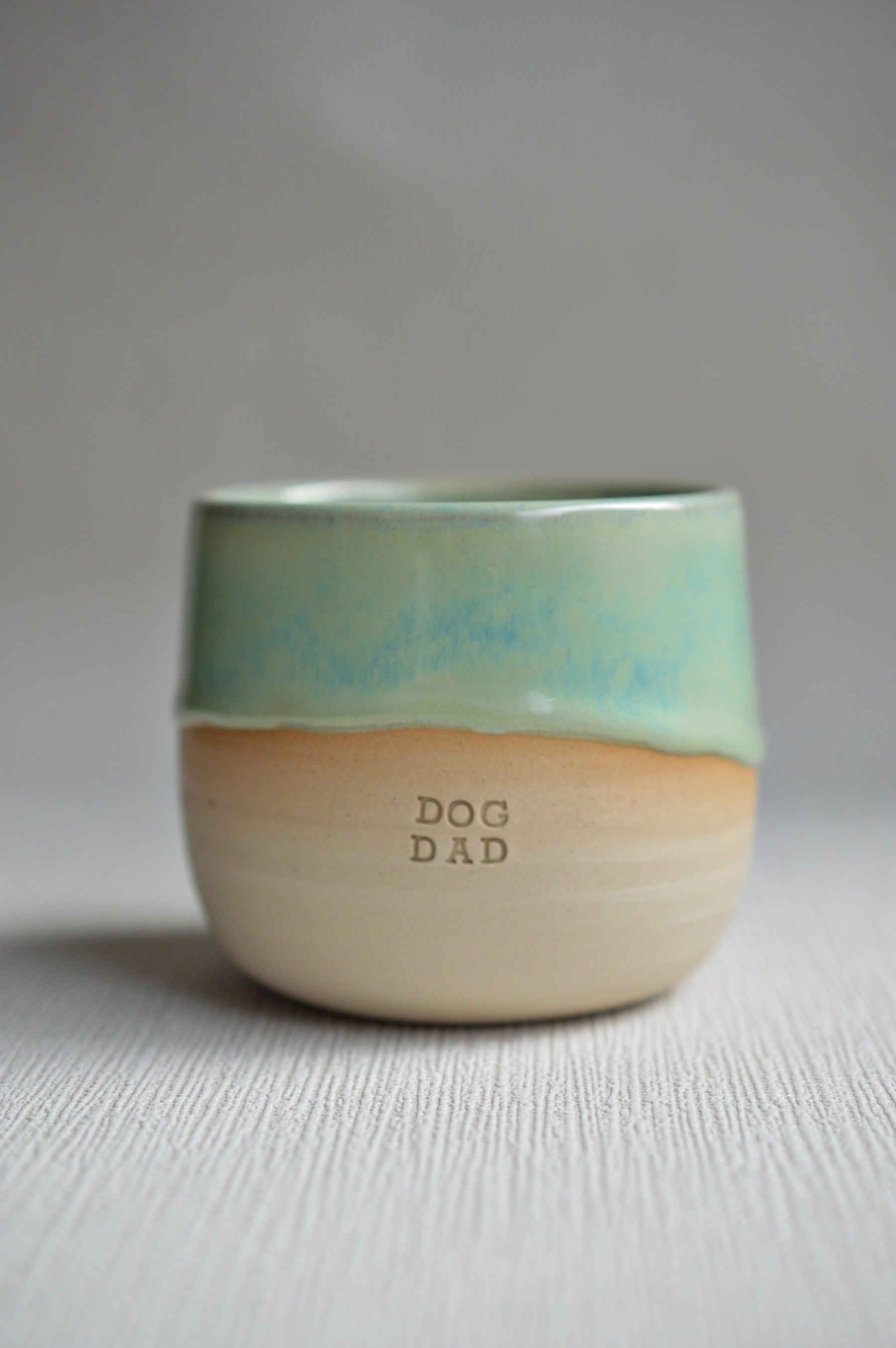Handgemachter Becher aus Steinzeugkeramik mit grüner Glasur und dem Schriftzug DOG DAD