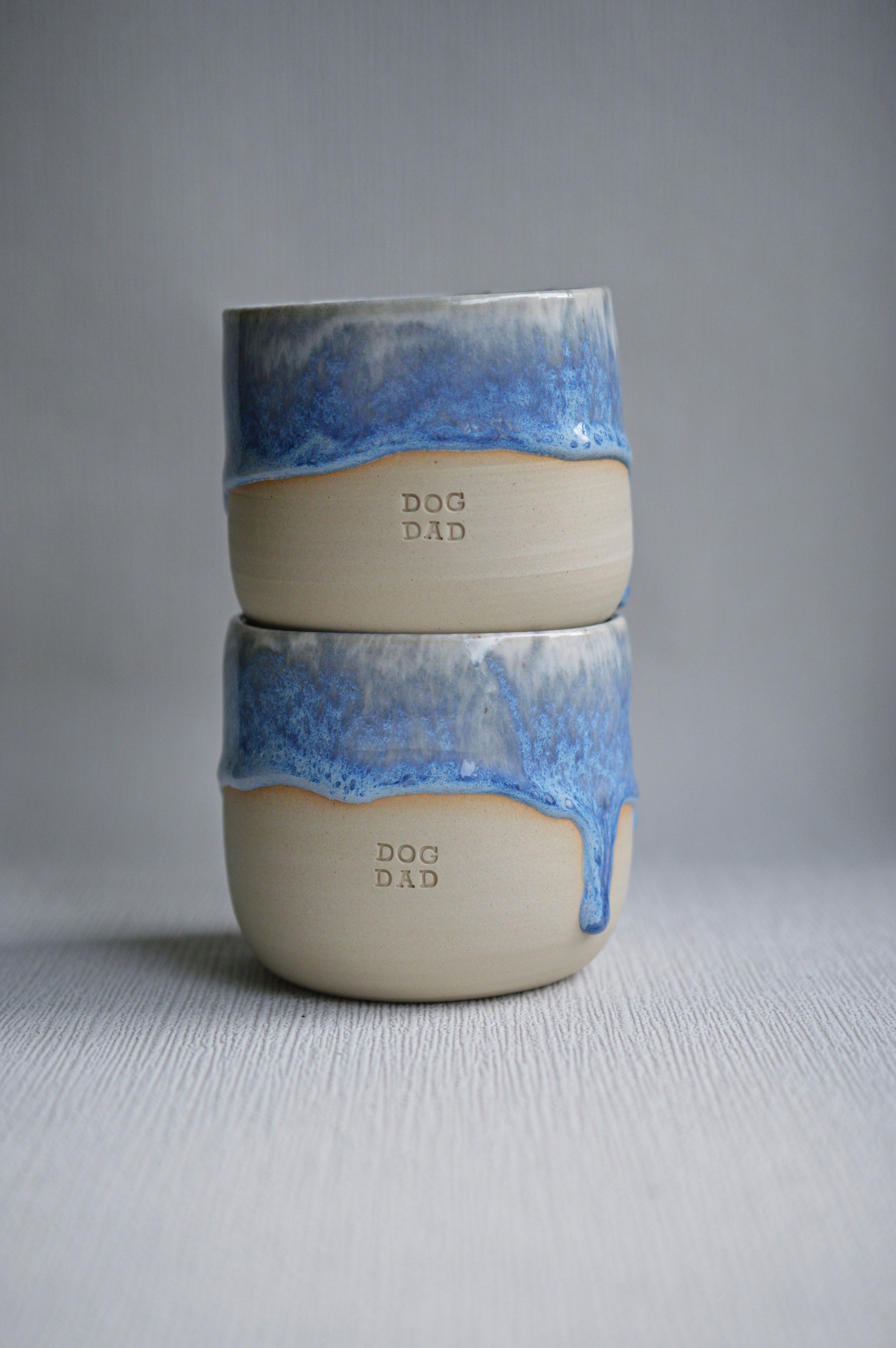 Handgemachter Becher aus Steinzeugkeramik mit blauer Glasur und dem Schriftzug Dog Dad